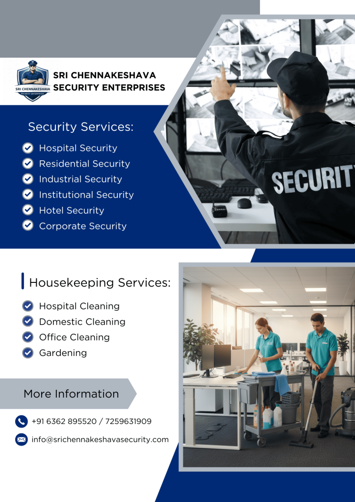 Sri Chennakeshava Security Enterprises is a trusted service provider delivering professional security and housekeeping solutions tailored to meet the diverse needs of hospitals, residential communities, industries, institutions, hotels, and corporate establishments. With a strong focus on safety, discipline, and reliability, the company offers well-trained security personnel for hospital security, residential security, industrial security, institutional security, hotel security, and corporate security, ensuring round-the-clock protection and peace of mind. Complementing its security expertise, Sri Chennakeshava Security Enterprises also provides comprehensive housekeeping services, including hospital cleaning, domestic cleaning, office cleaning, and gardening, maintaining clean, hygienic, and well-managed environments. Committed to quality service, professional standards, and customer satisfaction, the company stands as a dependable partner for secure and well-maintained spaces.